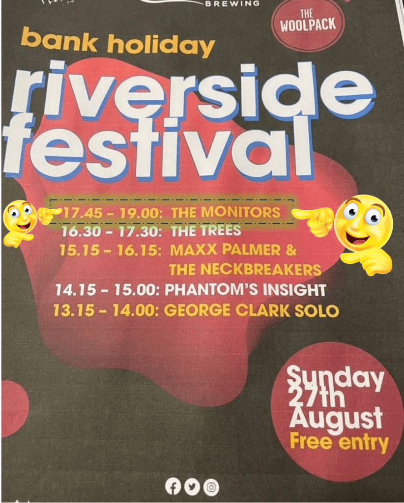 2022 presented a few challenges to The MONITORS. Injuries to Gary (guitar), Jane (guitar), and Steve (bass) throughout the year meant a requirement for a lot of deputising for us to meet our commitments. Special “thank you”‘s go out to our good friends Elliott Stout, Rick Cullen, and Gary Mackay for being kind enough to give us your time and expertise.